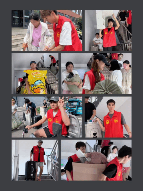 志愿者们肩扛手提往返奔忙。沉重的行李压弯臂膀,汗水浸透衣背,步履却始终坚定。他们默契配合传递箱箧,身影穿梭于各个楼道间,以高效协作筑起一条流动的搬运链,让温情在负重前行中悄然传递。